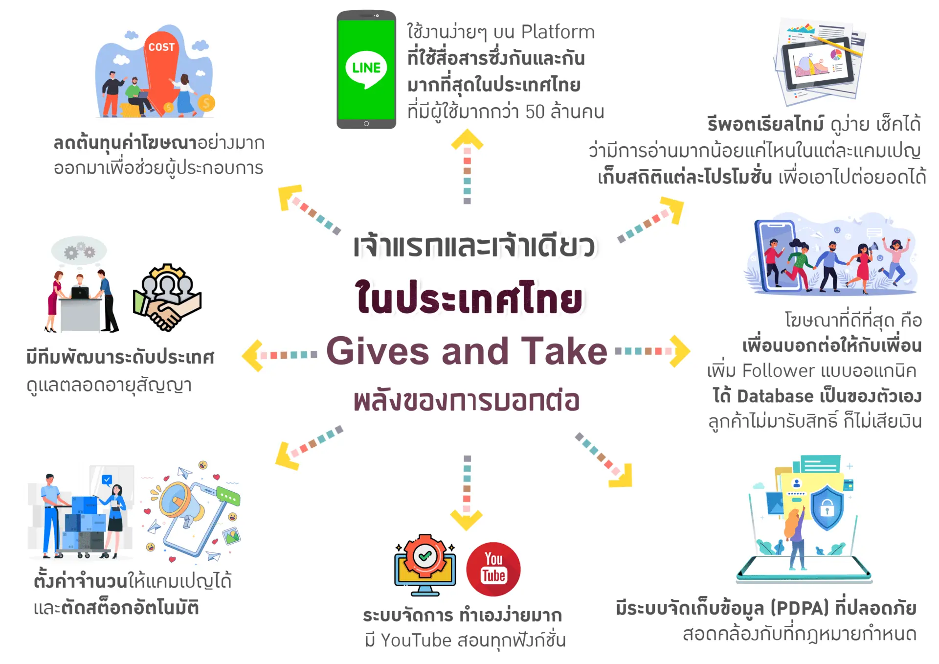 การโฆษณาที่ดีที่สุด คือ การให้ด้วยความหวังดี จากเพื่อนสู่เพื่อน หรือจากคนที่รักกันส่งให้กัน เป็นการโฆษณาที่ทรงพลังที่สุด เพิ่มเพื่อนแบบออแกนิคและผู้ติดตามเพิ่ม พร้อมฐานข้อมูลลูกค้าเป็นของตัวเอง นำไปต่อยอดในการทำธุรกิจได้อีกมากมาย และยังสามารถกำหนดเงื่อนไขในการรับโปรโมชั่น ได้อย่างง่ายดายด้วยต้วเองอีกด้วย